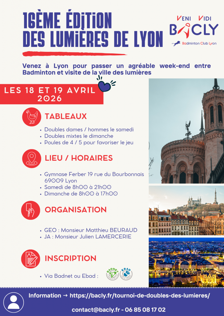 Le BAdminton Club de LYon est heureux de vous convier à sa 16ème édition nationale de Doubles et Mixtes » ECOBAD » des Lumières de Lyon