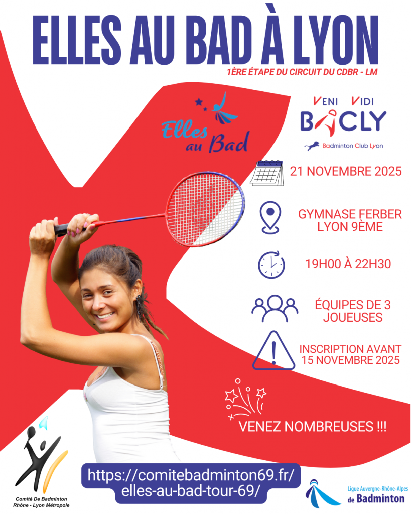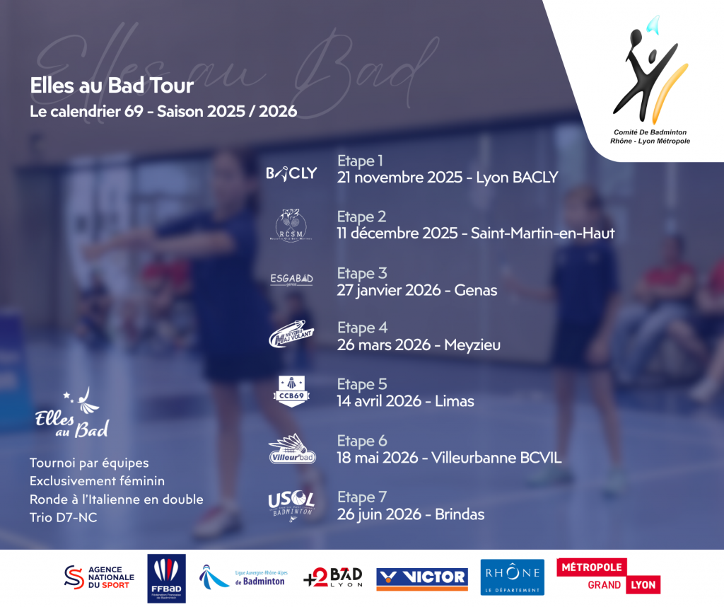 Le Comité de Badminton du Rhône – Lyon Métropole est fier de vous présenter le Elles au Bad Tour 69, déclinaison rhodanienne du circuit féminin créé en 2024 par la Ligue Auvergne-Rhône-Alpes de Badminton, en étroite collaboration avec celle-ci.