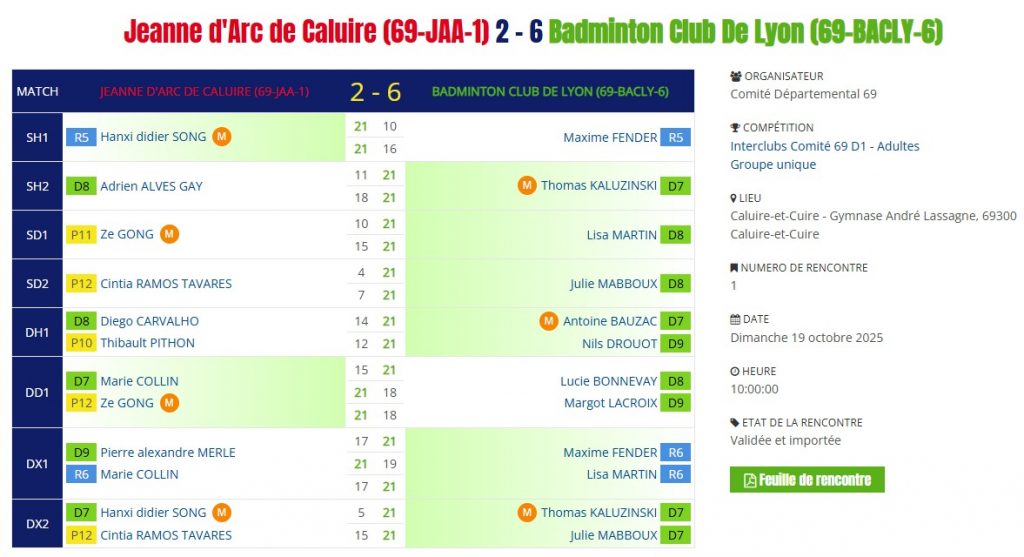 ❌ Défaite 1 à 7 contre l’équipe 1 de la JAAC Badminton de Caluire