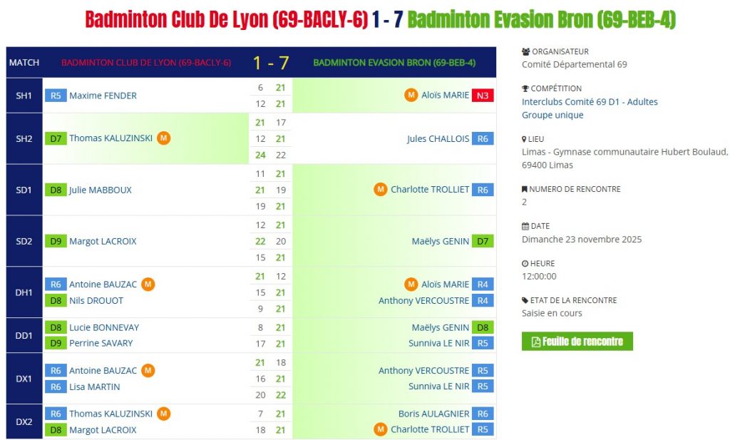 ❌ Défaite 1 à 7 contre l’équipe 4 du Badminton Evasion Bron