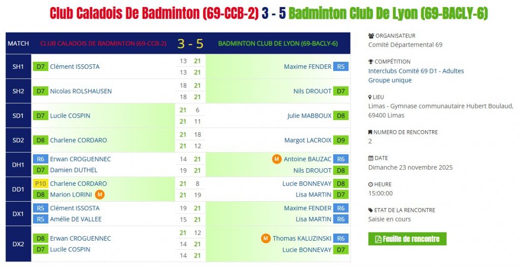 - 11h30 Vs le Club Caladois De Badminton 2