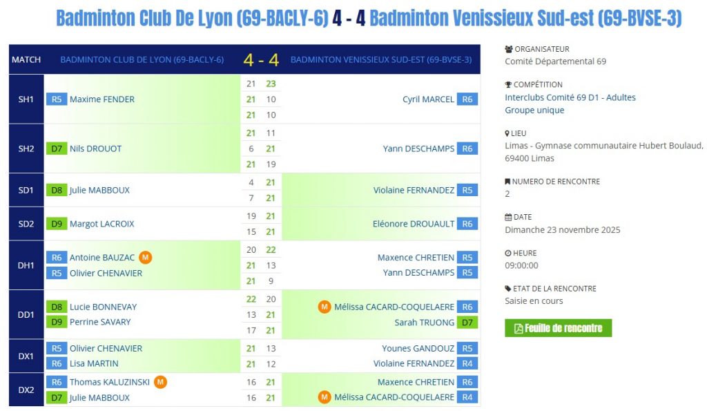- 14h30 Vs le Badminton Evasion Bron 4
