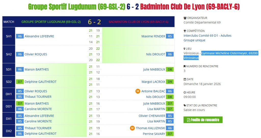 ✔️ Victoire 5 à 3 contre l’équipe 5 du Badminton Club Oullins