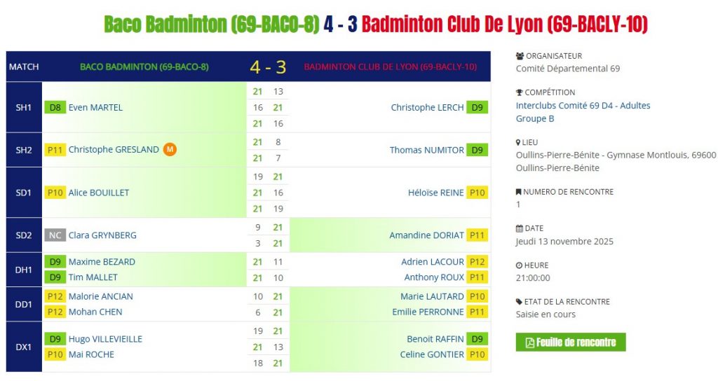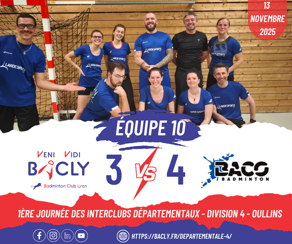 Défaite de l’équipe 10 : 3 à 4 contre l’équipe 8 du Badminton Club Oullins – BACO