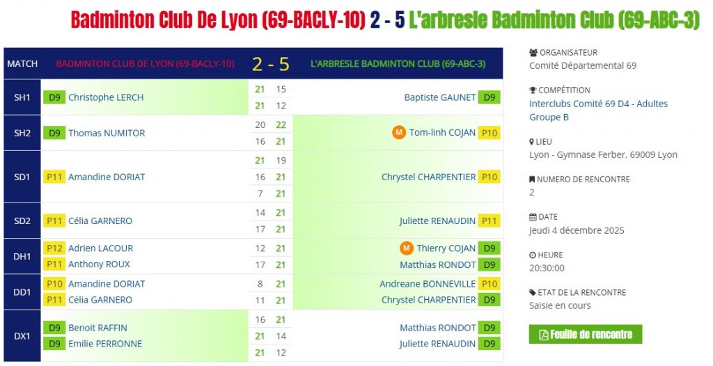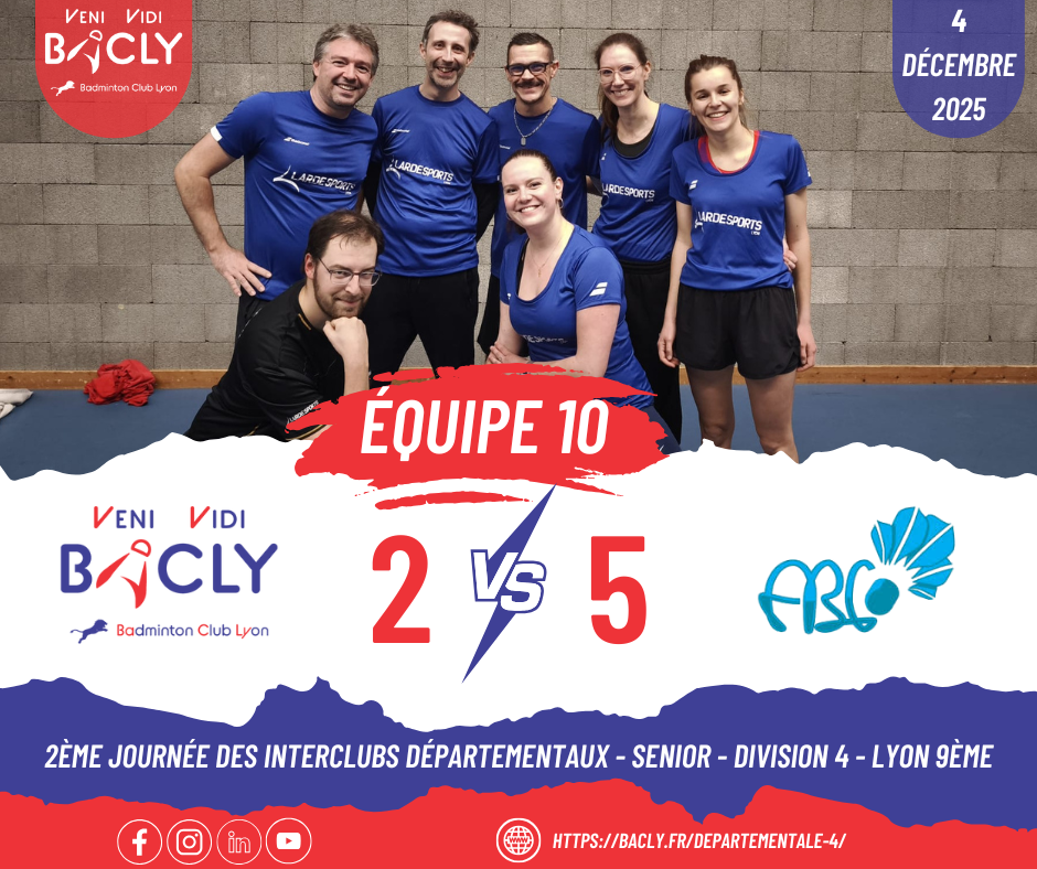 → Prochaine rencontre de l’équipe 10 le jeudi 4 décembre 2025 de 20h30 à 23h00 contre l’équipe 3 de l’Arbresle Badminton Club
