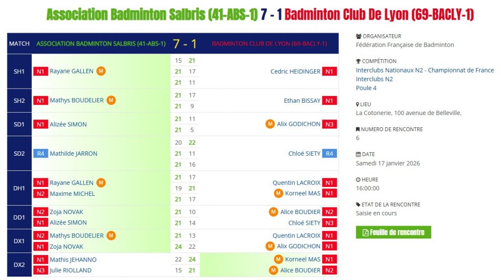 - Suivre la rencontre sur Badnet ou Ebad : CLIQUER →→→ ICI