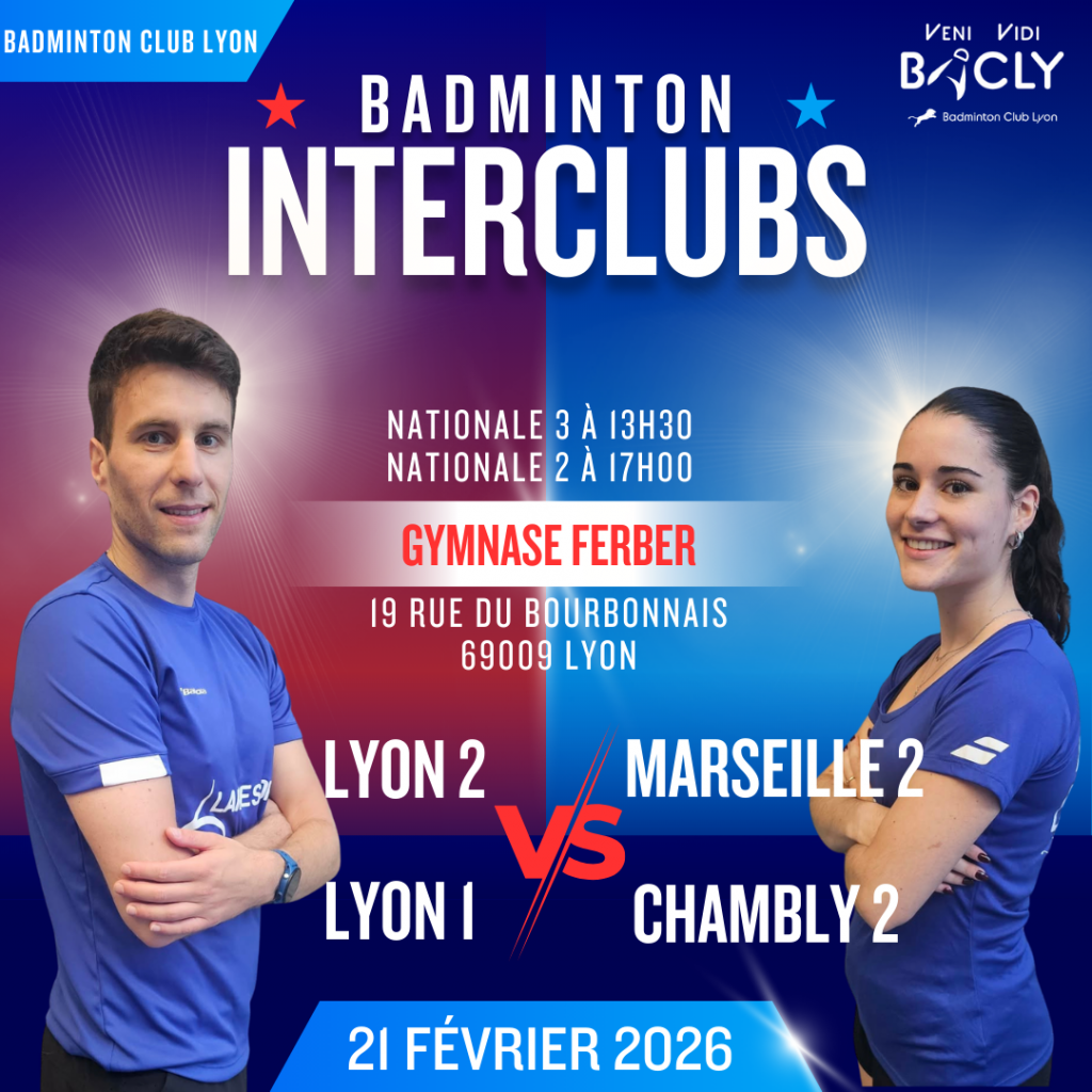 Réservez votre après-midi de 15h50 à 19h00 pour encourager les lyonnais du Badminton Club de Lyon. Les lyonnais seront opposés à l’équipe Bordelaise de l’Union Saint Bruno pour cette toute dernière journée du championnat de France par équipes de Nationale 1 de la saison 2021 / 2022