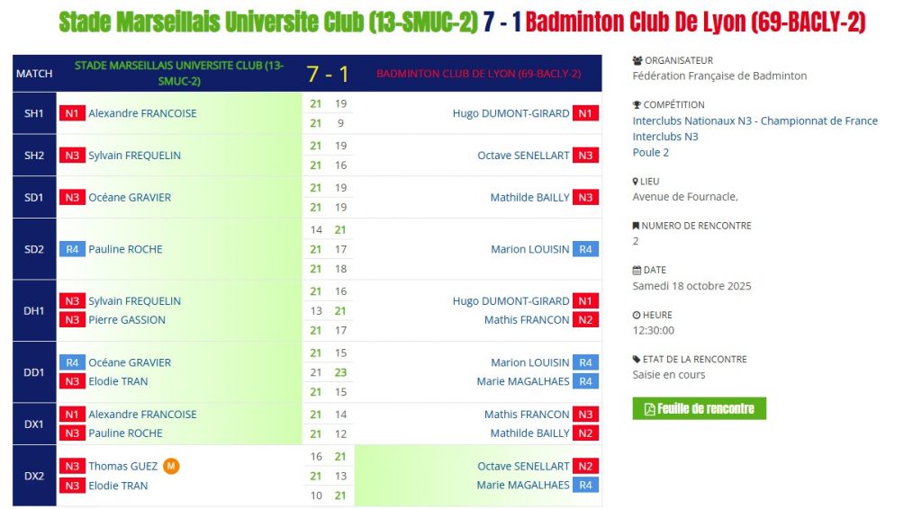 - Suivre la rencontre sur Badnet ou Ebad : CLIQUER →→→ ICI