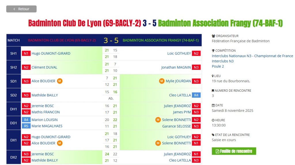 → Les résultats détaillés de la rencontre ci-dessous :