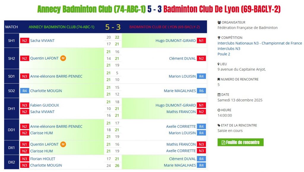 - Vs l’équipe 1 de l’ABC : Annecy Badminton Club