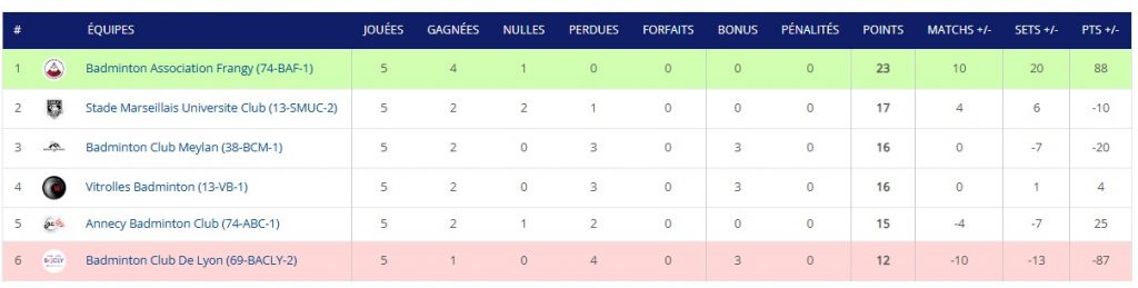 L’équipe 2 arrive donc seconde de sa poule et jouera les barrages pour l’ascension en Nationale 3 le dimanche 8 mai en Nationale 3 contre le 1er de l’autre poule de Pré-Nationale soit l’équipe 3 du Badminton Club Oullins.