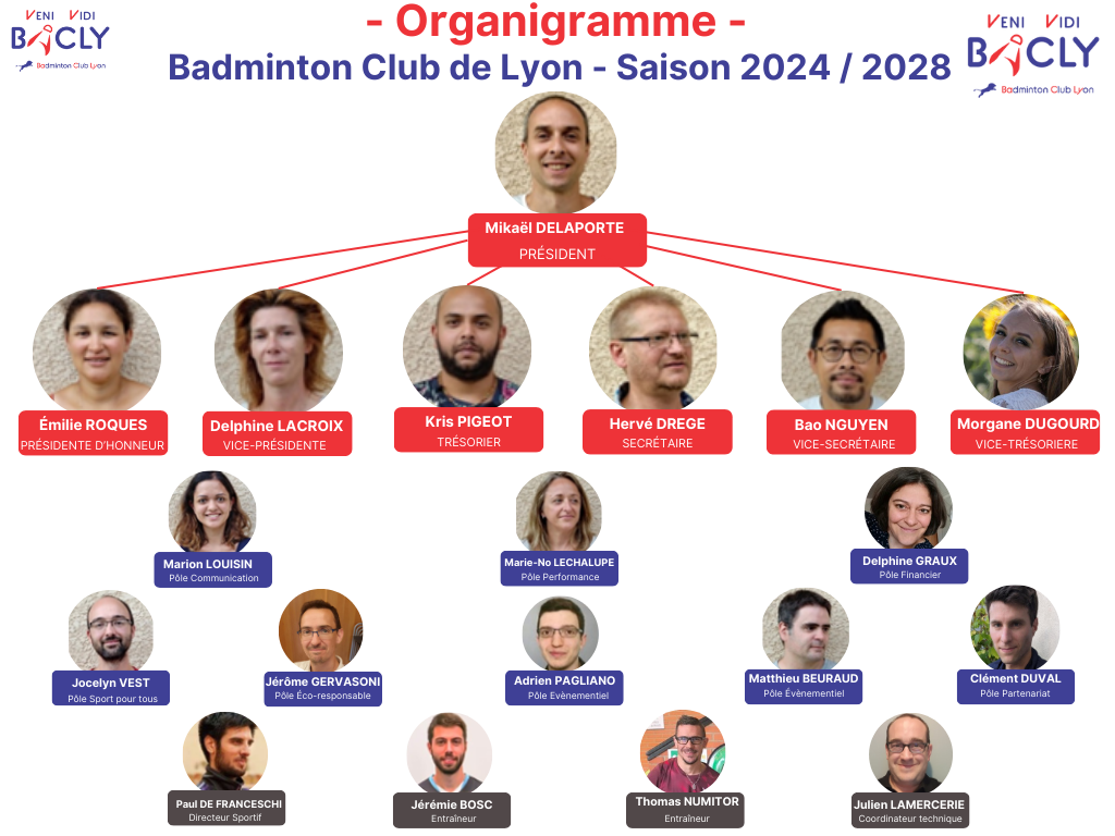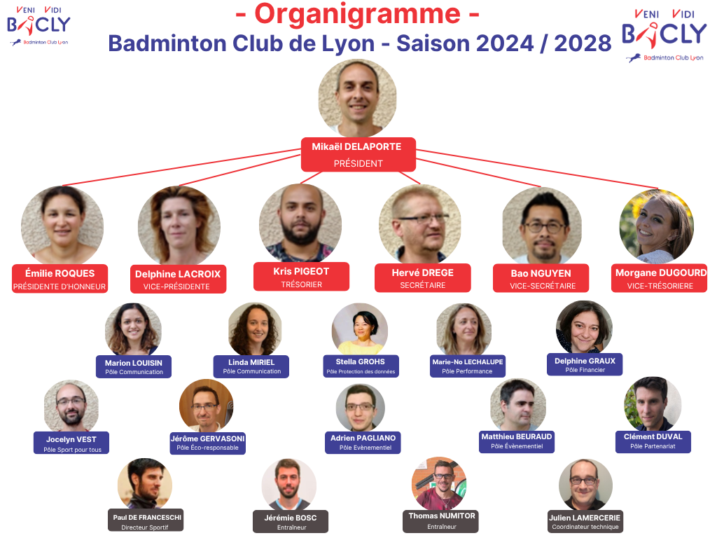 Ci-dessous la nouvelle équipe du Badminton Club de Lyon élue pour les 4 saisons à venir (2024 / 2028)