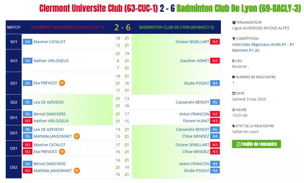 Résultats de la 5ème journée des interclubs pour l’équipe 3 du BACLY en régionale 1 le 20 mars 2022 à Clermont-Ferrand :