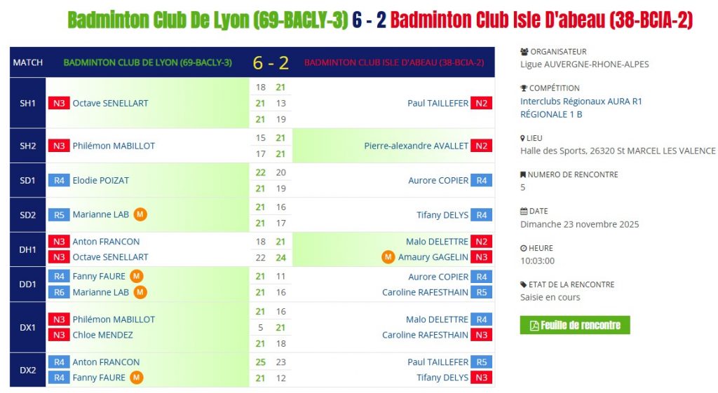 ❌ Défaite 6 à 2 contre les leaders de cette division, l’équipe 1 du Badminton Club Isle d’abeau