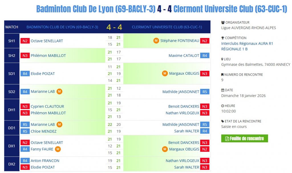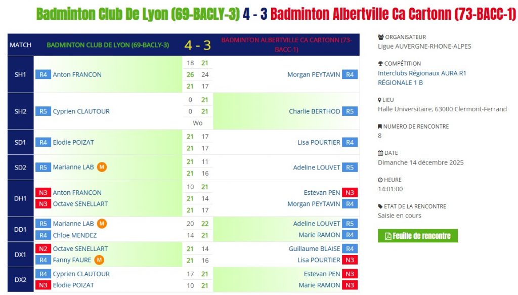 ❌ Une défaite 1 à 7 contre l’équipe 1 du Badminton Club de Chambéry 1
