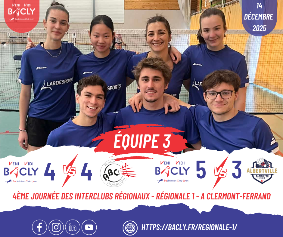 Résultats de la 3ème journée des interclubs pour l’équipe 3 du BACLY en régionale 1 le 12 décembre 2021 à Clermont-Ferrand :