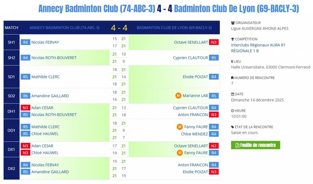 - 10h00 – Vs – Annecy Badminton Club 3