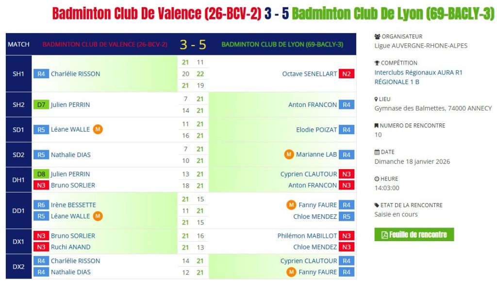 ✔️ Une victoire 5 à 3 contre l’équipe 2 du Badminton Club Valence