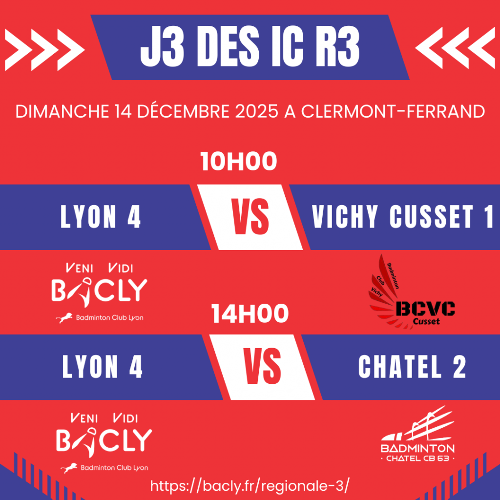 → Ci-dessous le calendrier des 5 rencontres de Régionale 3 pour l’équipe 4 du BAdminton Club de LYon :