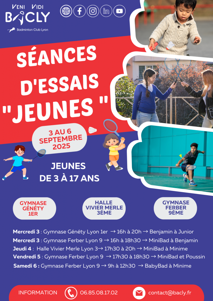 Le BAdminton Club de LYon vous propose des séances d’essais pour jeunes de 3 à 17 ans du 3 au 6 septembre 2025 sur 3 gymnases de la ville de Lyon